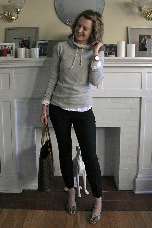 no 2) Funnel Neck Sweatshirt – A great pop on for lazy days or to and from the gym days. The funnel neck acts like a scarf keeping your neck warm, hence why it’s good for lazy days – skip the scarf. This is a great alternative to the hoodie from spring. You can switch between them for great casual layering items. [funnel neck image and hoodie image]